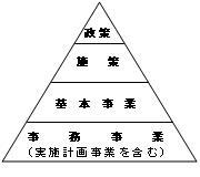 平成22年度(平成21年度の事後評価)から「事務事業評価」と「基本事業評価」の2層評価を導入しました。基本事業とは、政策の体系ピラミッド【右図】において事務事業の一つ上の階層の事業を指しています。