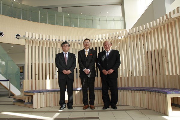 平成29年3月24日、秩父広域森林組合様から、スギ・ヒノキ・ケヤキ・カエデ・クリの5種類の秩父産木材で作られた特製家具「木のお休み処”笠ほこ”」を市へご寄贈いただきました。