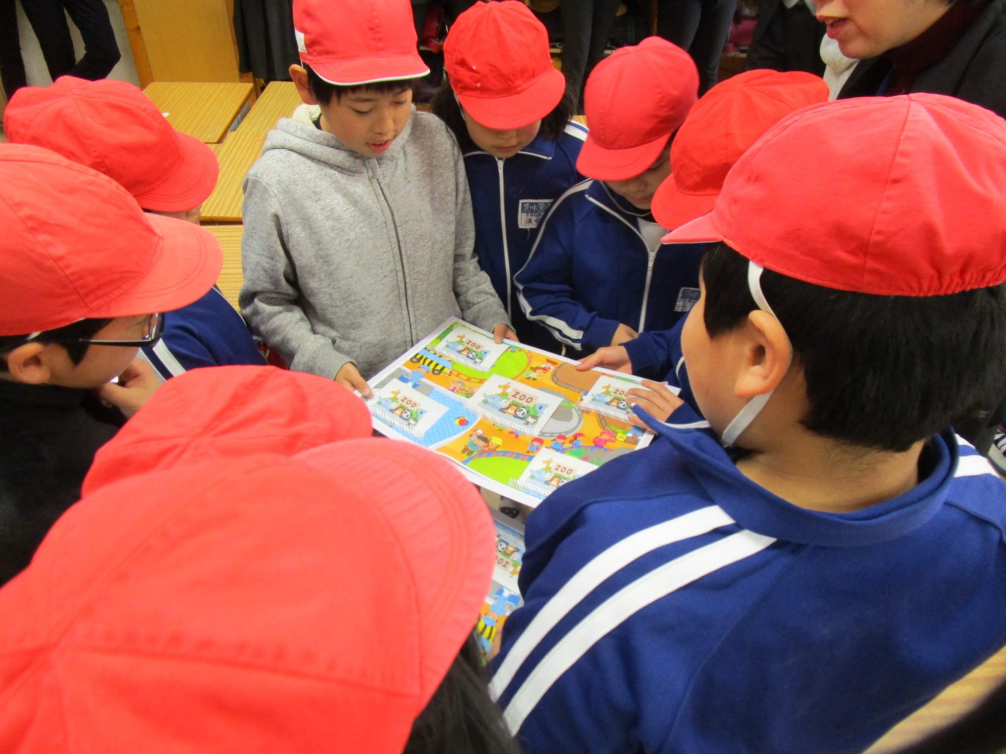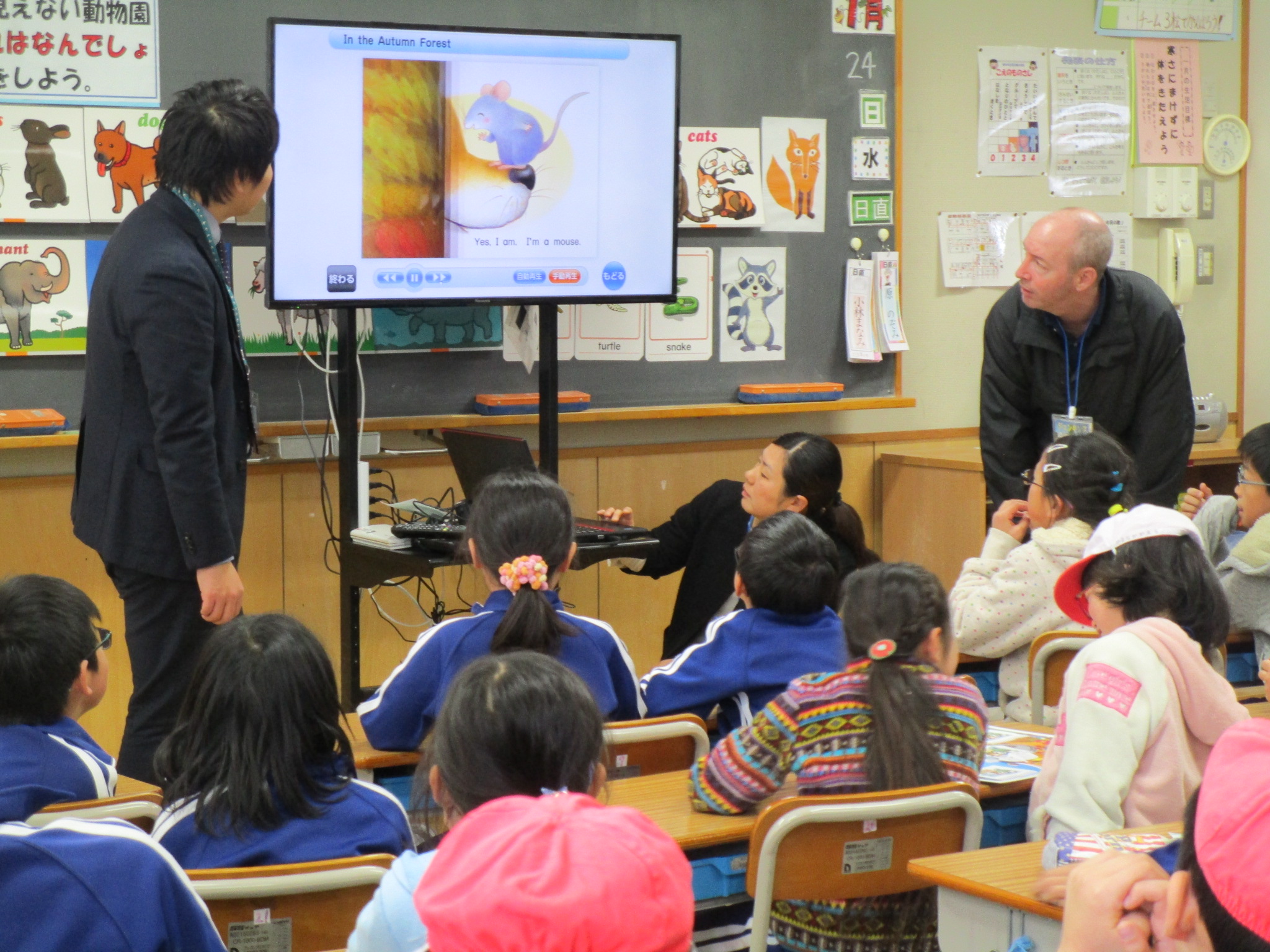 市内外小・中学校から27人の先生方が参加し、荒川東小学校の全先生方と一緒に研修に取り組みました。来年度から始まる中学年の外国語活動の授業提案として大変素晴らしい公開授業が行われました。授業はアルファベットがふんだんに出てくる英語の歌で楽しい雰囲気づくりから始まり、動物の語彙の慣れ親しみをピクチャーカードで行うなど楽しい活動が目白押しでした。ALTと学級担任の小林先生のチームワークの良い進行で子どもたちの興味は大きく膨らみます。事前に児童が作ったペーパーの動物を使って、「ちょっとしかみえない動物園」をグループで作りました。その動物園を持ち運びながら別のグループにWhat's this? と動物の体の一部分を見せながらクイズを出す活動が行われました。 また、絵本教材Story Books "In The Autumn Forest"を使って児童たちと What's this? Rabbit! などやりとりをしながら、絵本を楽しんでいました。